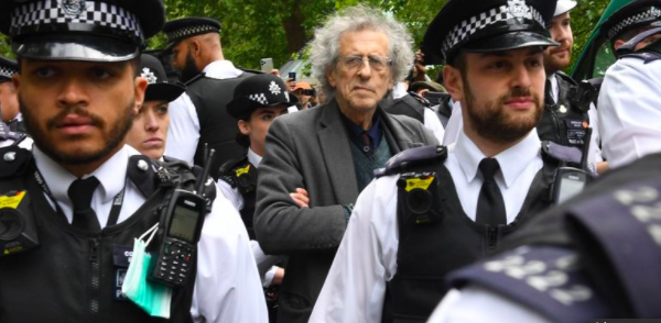 Police removed Piers Corbyn from the protest in handcuffs, after he joined with a megaphone voicing that 5G and the coronavirus pandemic were linked.